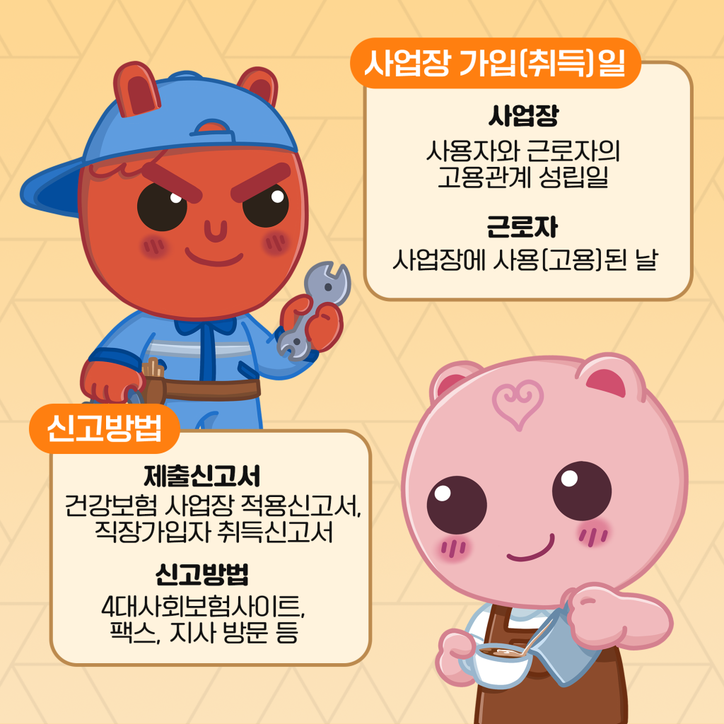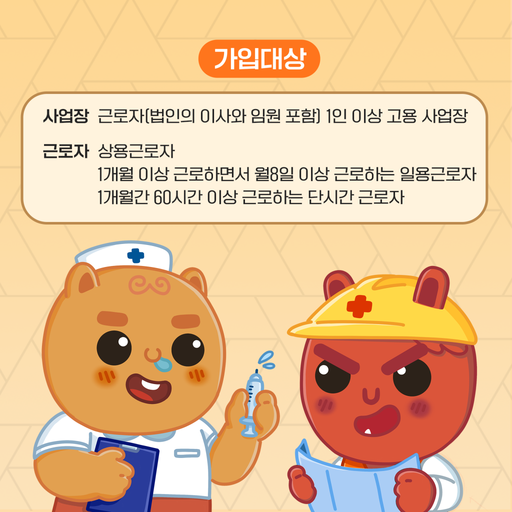 가입대상은 근로자(법인의 이사와 그 밖의 임원을 포함) 1인 이상 고용 사업장의 상용근로자, 1개월 이상 근로하면서 월 8일 이상 근로하는 일용근로자, 1개월간 60시간 이상 단시간근로자이다. 사업장 가입일은 사용자와 근로자 간 고용관계 성립일, 근로자 취득일은 사업장에 고용된 날로 한다.