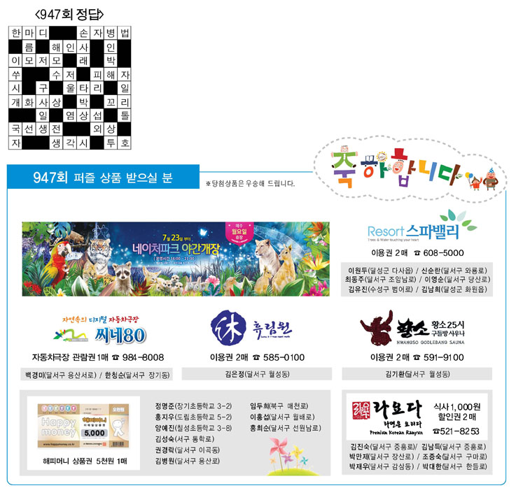 ♣ ‘가족과 함께 풀어보세요’정답을 아시는 분은 본사 편집부로 보내주시기 바랍니다. 11월 26일까지 도착된 엽서 중에서 추첨을 통해 상품을 드립니다. 주소를 정확히 기재해 주십시오. 당첨상품을 우송해 드립니다.
