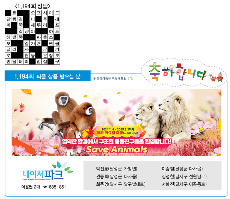 ♣ ‘가족과 함께 풀어보세요’정답을 아시는 분은 본사 편집부로 보내주시기 바랍니다. 11월 26일(화)까지 도착된 엽서 중에서 추첨을 통해 상품을 드립니다. 주소를 정확히 기재해 주십시오. 당첨상품을 우송해 드립니다.
