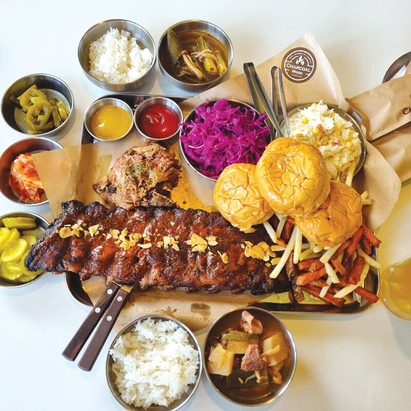 모닝빵과 달콤한 야채들이 등장할 때부터 입이 떡 벌어지는 푸짐함을 자랑한다. 모닝빵 안에 야채들과 잘게 찢어놓은 돼지 어깨살을 듬뿍 넣어 차콜우드 전용 소스를 마구마구 뿌려 햄버거를 만들어 먹으면, 시중에 파는 햄버거들은 거들떠보지도 않게 된다. 돼지갈비는 손만 쓱 닿아도 살이 쏙 빠져, 야들하고 부드러워서 입에 넣으면 살살 녹아 없어진다.
