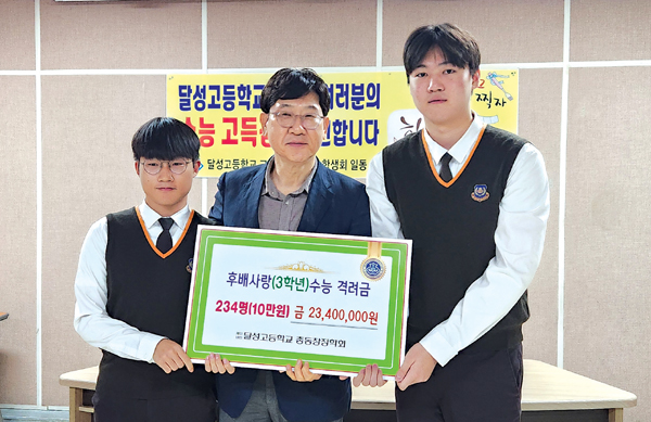 달성고등학교(교장 길호욱)은 (재)달성고등학교 총동창장학회(이사장 김창홍)에서 2024년 대학수학능력시험을 앞둔 고3 수험생 234명에게 1인당 10만 원의 수능 응원 격려금을 지급했다.