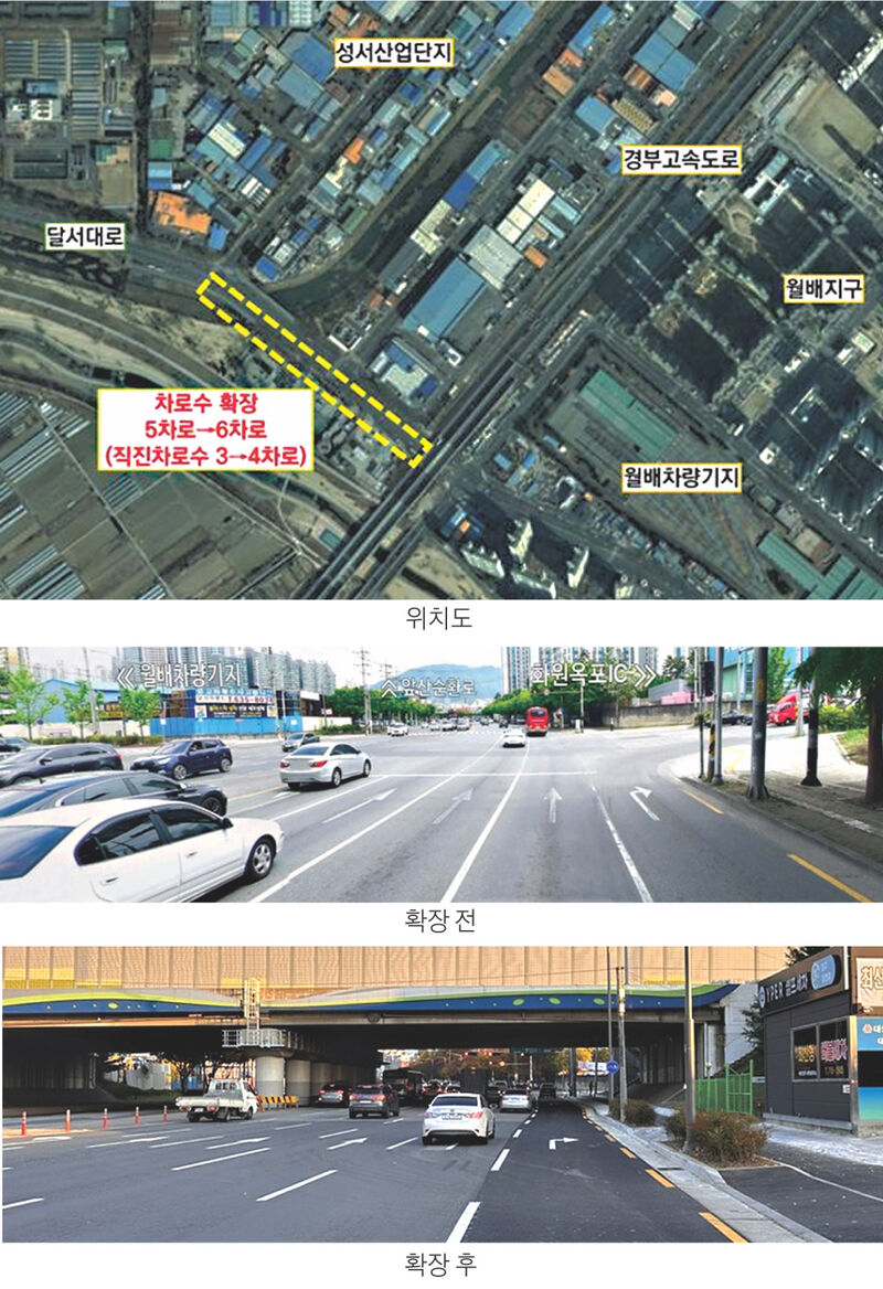 대구광역시는 성서공단 주변 주요간선도로인 달서대로(대천교삼거리~유천포스코네거리, 연장 640m) 일부 구간의 차로를 5개 차로에서 6개 차로로 확장하는 공사를 지난 14일(목)에 마무리해 출·퇴근길 교통혼잡을 개선하게 됐다.