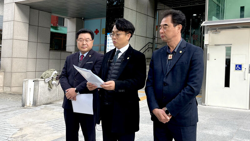 달서구의회 서민우 의장(가운데), 정창근 부의장(오른쪽), 도하석 운영위원장(왼쪽)이 더불어민주당 대구시당 앞에서 A구의원에 대한 조치를 촉구하는 기자회견을 하고 있다.