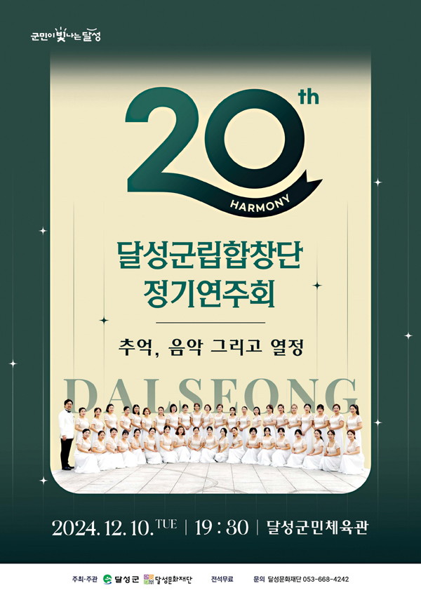 달성문화재단(이사장 최재훈)은 오는 12월 10일(화) 오후 7시 30분 달성군민체육관에서 ‘제20회 달성군립합창단 정기연주회’를 개최한다. 이번 공연은 ‘추억, 음악 그리고 열정’이라는 주제로 지휘자 박찬일, 반주자 조윤지, 그리고 아나운서 양채원의 사회로 진행된다.