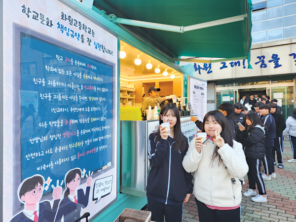 특히, 학교문화 책임 규약 실천 우수 학생을 선정해 격려하고 응원 메시지를 전달하기 위해 ‘화원 커피차’를 배치하여 특별한 선물도 증정했다. 커피차에서 제공된 음료는 학생들뿐만 아니라 교직원들에게도 따뜻한 격려의 시간이 됐다.