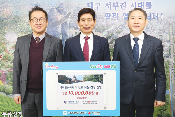 계명1%사랑나누기(대표 신일희)는 지난달 25일(월) 후원금 1,000만 원을 달서구에 기탁했다.