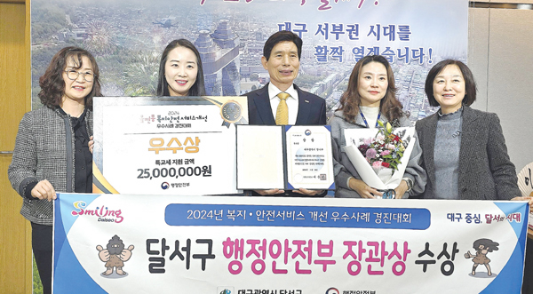 달서구(구청장 이태훈)가 행정안전부 주관 2024년 복지·안전서비스 개선 우수사례 경진대회에서 위기가구 발굴·지원‘달서복지 4U’사업으로 우수상을 수상해 특별교부세 2,500만 원을 지원받는다. ‘달서복지 4U’ 사업은 위기가구 발굴·지원을 위한 △사회관계망 강화 △인적 안전망 역량 강화 △신속하고 두터운 지원 △ 공감과 참여의 확대 4단계 위기가구 발굴·지원 시스템이다. <자료제공:달서구청>