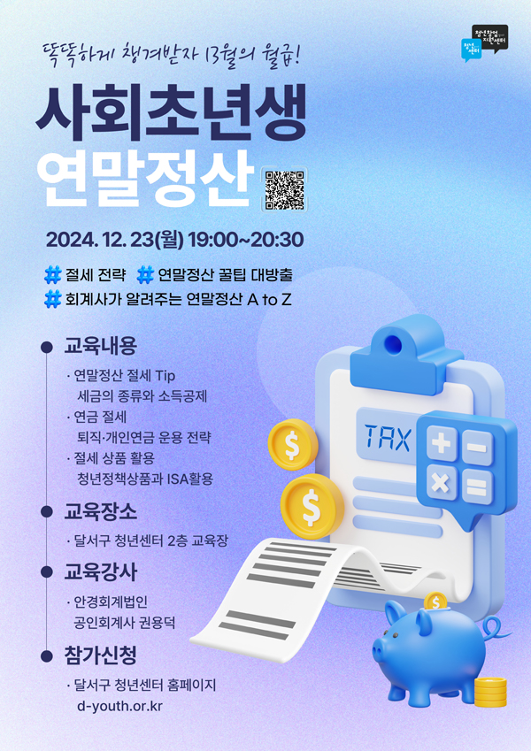 이번 특강은 연말정산을 처음 맞이하는 청년들을 위한 역량강화 프로그램으로, 안경회계법인 권용덕 공인회계사가 ▶연말정산 기본 개념, ▶세액공제 활용 방법, ▶연금 운영 전략, ▶청년정책상품과 ISA 활용 등에 대해 강의할 예정이다.