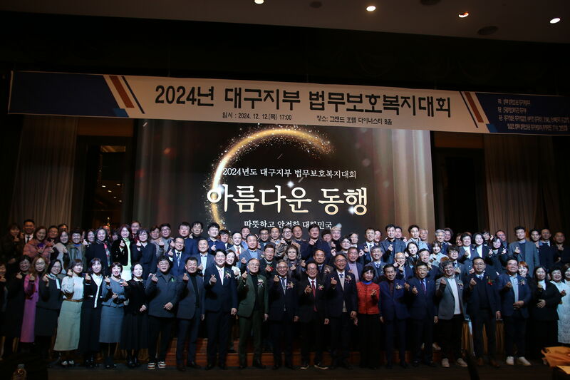 한국법무보호복지공단 대구지부(지부장 임동문)는 지난 12월 12일(목) 대구 그랜드호텔(대구시 수성구 소재)에서 김형태 대구가정법원장, 한국법무보호복지공단 황영기 이사장, 대구지방검찰청 유도윤 제1차장 검사, 대구지방검찰청 서부지청 이 춘 차장검사, 대구지부협의회 곽진섭 협의회장 및 법무보호위원 120여 명이 참석한 가운데 한국법무보호복지공단 대구지부가 주관하고 법무부 법무보호위원 대구지부협의회(회장 곽진섭)가 주최하는 「2024 대구지부 법무보호복지대회」를 개최하였다.