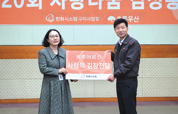 대구지방보훈청(청장 강윤진)은 지난 9일(월) 2024년 동절기를 맞아 한화시스템 구미사업장에서 개최한 ‘제20회 사랑나눔 김장 전달식’을 에 실시했다. 이번 사랑나눔 김장 지원은 경북 구미 지역에 거주하는 보훈가족에게 김장김치(7㎏) 100박스를 지원했다.