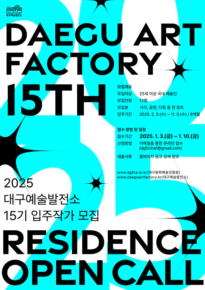 대구예술발전소는 작업의 질적 성장 및 발전 방향성 구축을 위해 다양한 프로그램 및 창작활동을 지원하는 레지던시 입주작가 모집을 12월 23일(월) 공고 후, 2025년 1월 3일(금)부터 1월 10일(금) 오후 6시까지 이메일을 통한 온라인 접수로 진행한다.