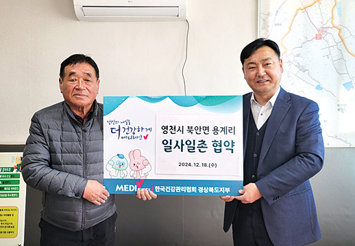 한국건강관리협회 경상북도지부(이하 건협 경북지부, 본부장 정성윤)는 지난 18일(수) 영천시 북안면 소재의 용계리 농촌 마을과 1사1촌 협약을 맺고 상생협력을 약속했다. 이번 협약을 통해 건협사랑어머니봉사단의 농촌 일손 돕기 봉사활동, 마을 내 취약계층 지원과 같은 사회공헌활동과 마을주민들을 위한 건강증진서비스지원 등 지역사회 발전을 위한 상생활동을 함께 하기로 상호 협의했다. <자료제공:한국건강관리협회 경상북도지부>