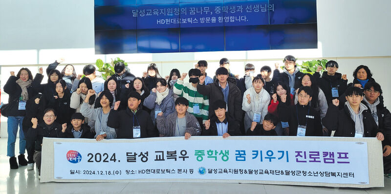 대구달성교육지원청(교육장 김태헌)은 지난 18일(수) 달성군 테크노폴리스 소재 HD현대로보틱스(주) 본사에서 ‘달성 교복우 중학생 꿈 키우기 진로캠프’를 실시했다. 이번 행사는 관내 교육복지우선지원 중학생 32명을 대상으로, 지역 우수기업 탐방과 진로체험을 통해 학생들의 학업 동기를 높이고 미래 진로 설계에 도움을 주고자 마련됐다.