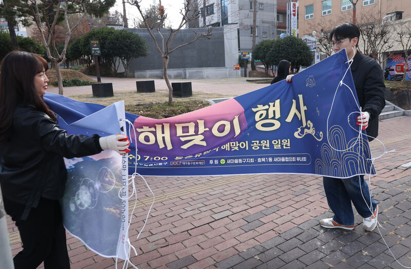 대구 동구 직원들이 해맞이 행사 취소에 따라 현수막을 철거하고 있다 [연합뉴스제공, 무단 전재-재배포, AI 학습 및 활용 금지]