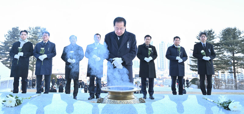 홍준표 대구광역시장은 2025년 을사년 새해를 맞아 지난 2일(목) 오전 9시, 시 간부 공무원 50여 명과 함께 순국선열과 호국영령들의 충의와 위훈을 기리고 대구발전의 결의를 다지기 위해 앞산 충혼탑에서 신년 참배를 실시했다. 참배는 헌화·분향·묵념 순으로 진행됐다.