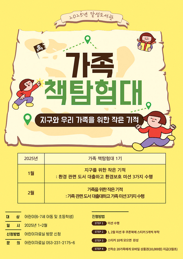대구광역시립달성도서관(관장 정현호)은 2월까지 어린이(6~7세 아동 및 초등학생)가족을 대상으로 미션형 독서 프로그램 ‘가족 책탐험대(1기)’를 운영한다.