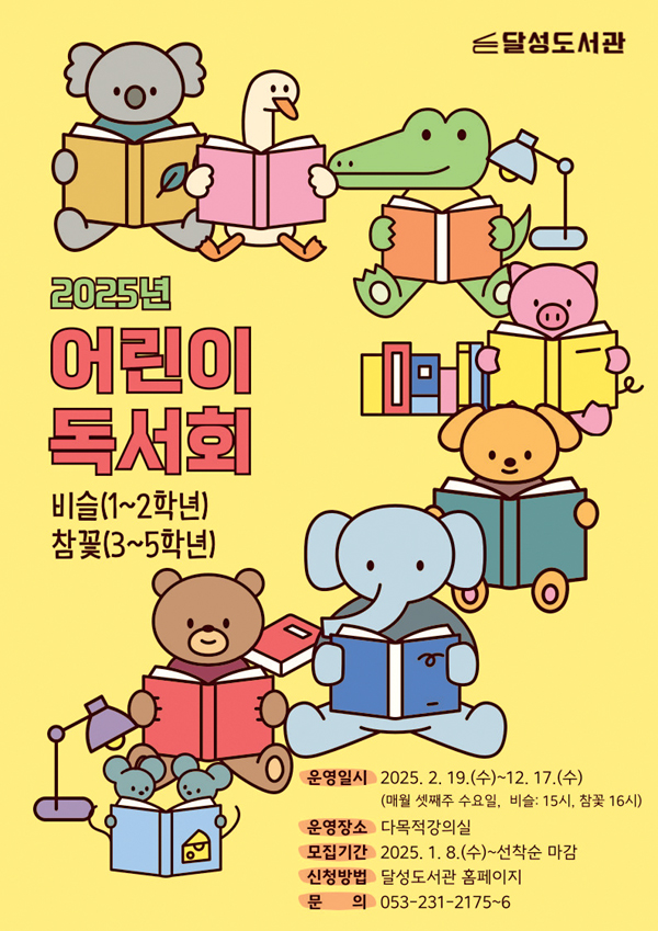 독서회 회원은 1월 10일(금)~22일(수)까지 달성도서관 홈페이지를 통해 선착순으로 모집되며, 자세한 사항은 어린이자료실(☎231-2175)로 문의하면 된다.