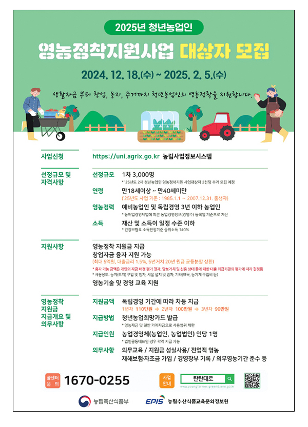 ‘청년농업인 영농정착지원사업’은 초기 소득이 불안정한 청년농업인들을 위해 마련됐으며, 최장 3년간 최대 110만 원을 매월 바우처 형식으로 지급해 가계 및 영농자금으로 사용할 수 있도록 지원하는 사업이다. 이 사업에 선정된 자들은 후계농과 같은 조건으로 정책자금을 대출받을 수 있다.