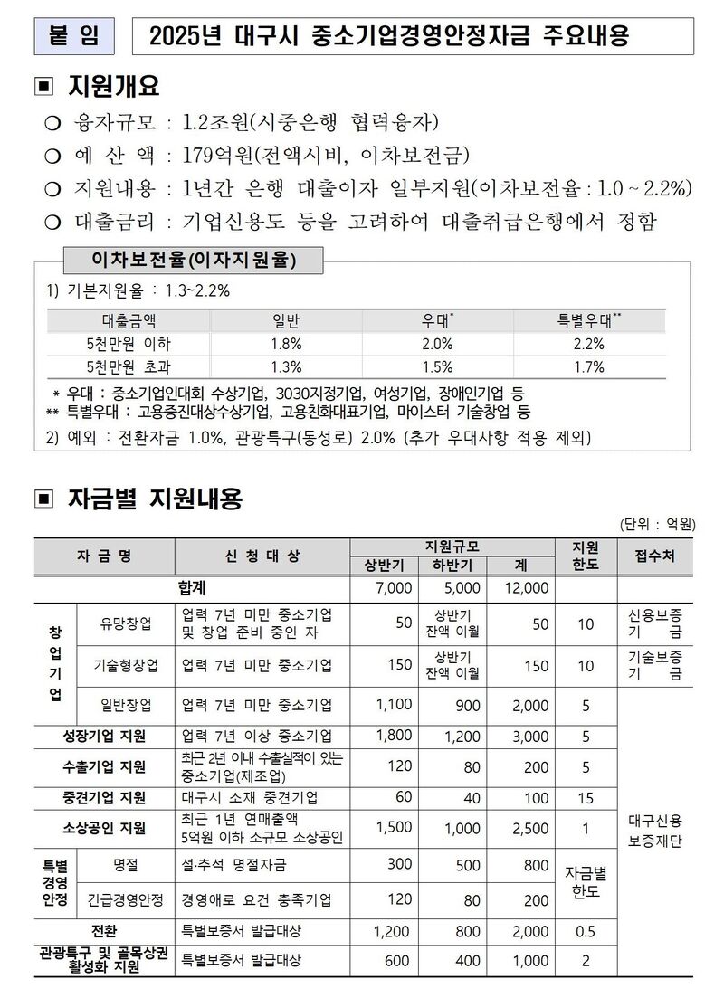 대구광역시는 지역 중소기업(중견기업 포함)과 소상공인의 금융 비용 경감 및 경영안정 도모를 위해 1.2조 원 규모의 2025년 대구광역시 중소기업경영안정자금을 지원한다.