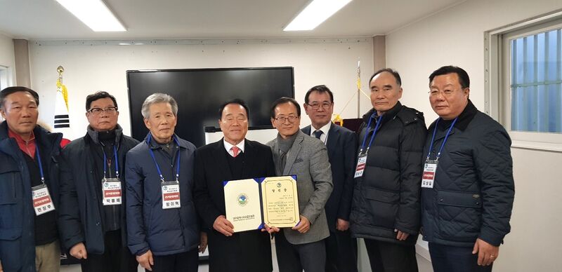 ▲이성수 후보가 선거운영위원회로부터 당선증을 수여받고 있다. 김영조 기자