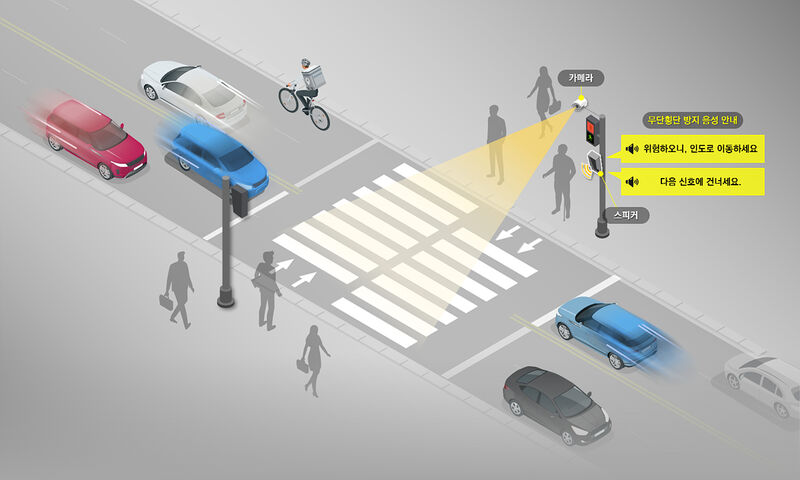 횡단보도를 건너려는 보행자가 안전지역을 벗어나 무단횡단을 시도하면 “위험하오니 인도로 이동하세요.”라는 음성 메시지로 위험을 알려주고, 녹색신호 잔여 시간이 보행자가 건너야 할 거리에 비해 부족한 경우에는 “다음 신호에 건너세요.”라는 음성 안내를 내보낸다.