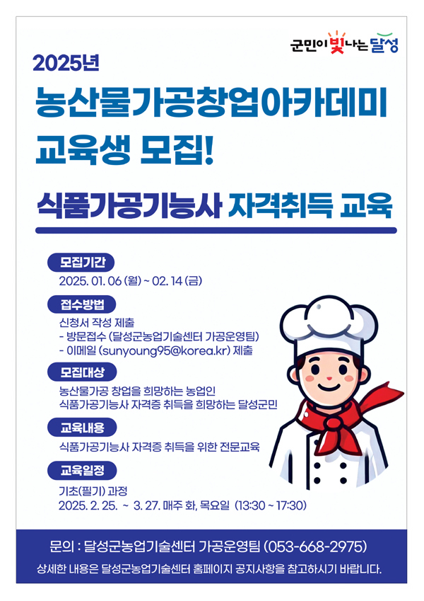 달성군(군수 최재훈)은 농산물가공 창업 지원 및 식품가공 전문가 양성을 위한 ‘농산물가공 창업아카데미’ 교육생을 2월 14일(금)까지 모집한다.