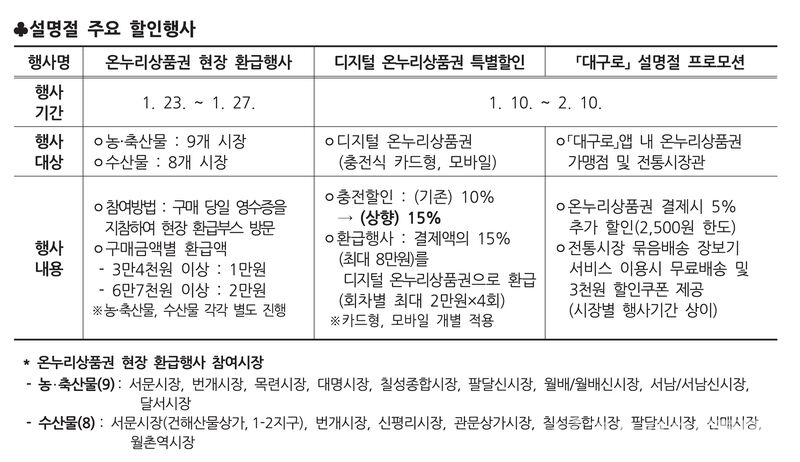 농·축산물 환급행사와 수산물 환급행사가 따로 진행되고, 행사기간 동안 1인당 최대 2만 원까지 환급받을 수 있어, 농·축산물과 수산물을 모두 구입할 경우 1인당 최대 4만 원까지 환급받을 수 있다. 그리고 전통시장과 상점가의 활성화를 위해 디지털(카드형, 모바일) 온누리상품권의 특별 충전할인 및 환급행사를 오는 2월 10일(월)까지 시행한다.