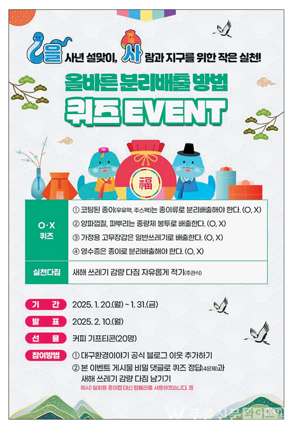 이번 설에는 ‘설맞이 올바른 분리배출 OX퀴즈 이벤트’를 추진해 평소보다 많이 발생하는 분리배출 대상 쓰레기 처리 방법을 홍보하고, 쓰레기 감량 실천 다짐 댓글을 작성해 명절 기간 시민들의 자발적인 생활쓰레기 감량을 유도할 계획이다.