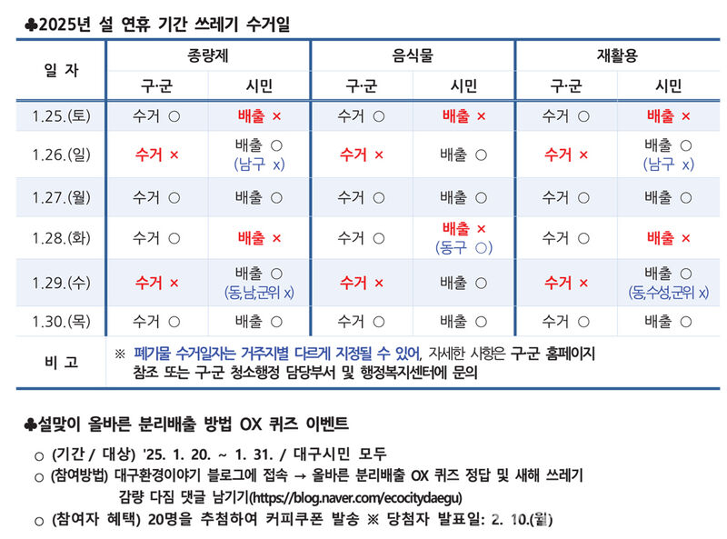 특히, 이번 연휴에는 일요일인 연휴 2일차(26일) 및 설 당일(29일) 쓰레기를 수거하지 않으므로, 25일(토) 및 28일(화)에는 쓰레기를 배출하지 않도록 유의해야 한다.