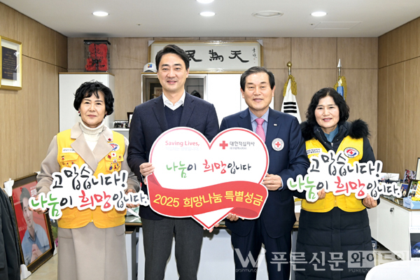 달성군(군수 최재훈)은 지난 15일(수) 적십자 모금 운동에 대한 군민의 관심을 모으고 자발적 참여 분위기를 조성하고자 대한적십자사 대구지사에 `2025년도 적십자 희망나눔 특별성금’ 100만 원을 전달했다. 이날 최재훈 달성군수를 비롯해 박명수 대한적십자사 대구지사회장 등이 참석한 가운데 특별성금을 전달한 달성군은 2024년도 적십자 회원모집과 회비모금에 적극적으로 협조한 공로로 감사패를 수상했다.