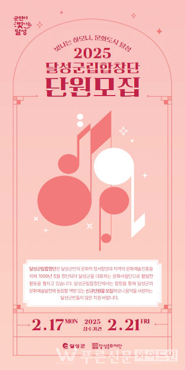 (재)달성문화재단(이사장 최재훈)에서는 달성군을 대표하는 문화예술단체인 달성군립합창단과 함께할 역량 있는 신규 단원을 모집한다.