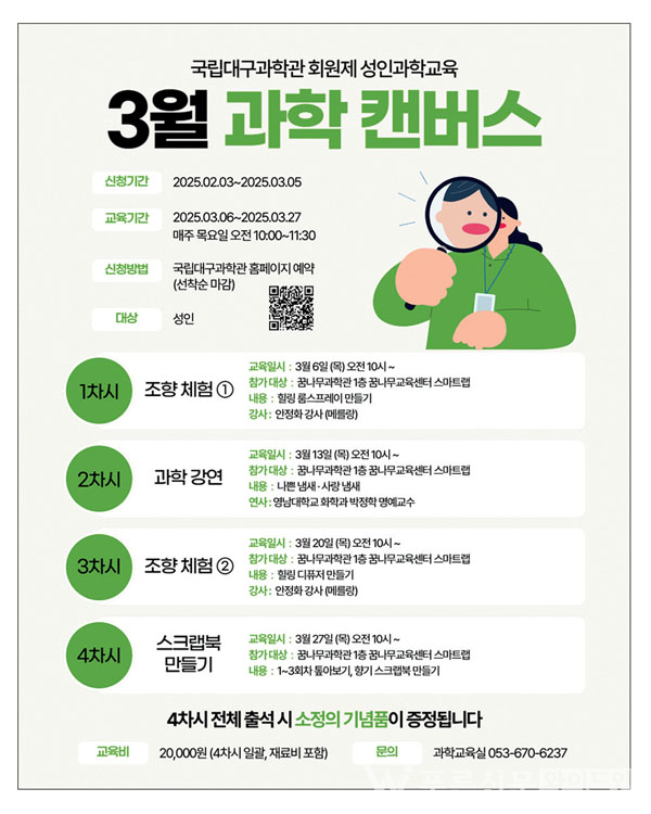 국립대구과학관이 성인 대상 회원제 과학교육 프로그램인 ‘월간 과학 캔버스’를 매월 회원을 모집해 운영한다. ‘월간 과학 캔버스’ 프로그램은 올해 1월 새롭게 개관한 꿈나무과학교육센터에서 매주 목요일 오전 10시에 진행되며, 총 4차시로 구성된다.