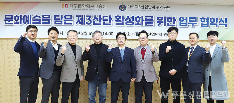 대구문화예술진흥원(원장 박순태, 이하 ‘진흥원’)과 대구제3산업단지 관리공단(이사장 홍종윤, 이하 ‘관리공단’)은 지역 발전 및 도시 성장기반 구축을 위해 지난 5일(수) 제3산업단지관리공단 사무실에서 업무협약을 체결했다.