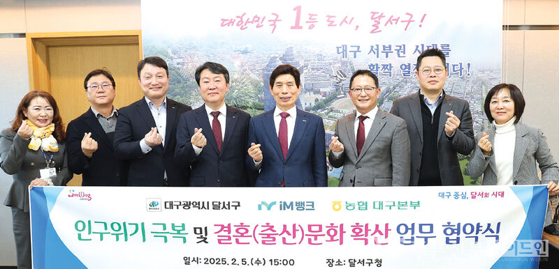 달서구(구청장 이태훈)가 달서구청에서 iM 뱅크(은행장 황병우), 농협 대구본부(본부장 전경수)와 업무협약을 체결했다. 이번 협약을 통해 세 기관은 초저출생 인구위기 극복과 ‘잘 만나보세’ 뉴(NEW) 새마을운동(결혼문화) 확산을 위해 공동 대응하기로 했다.