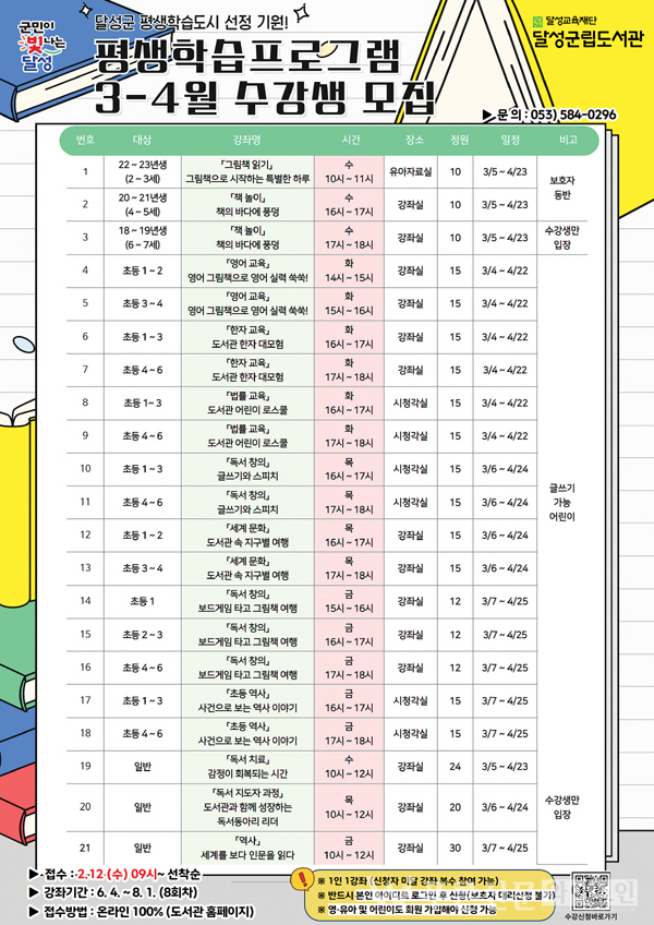 달성군립도서관(관장 김영선)은 2025년 평생학습 프로그램 1분기 수강생을 모집 중이다.