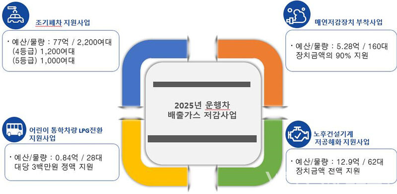그리고, 조기폐차 지원사업 외에도 매연저감장치 부착 지원(2026년 마감예정), 건설기계 저공해 조치 지원, 어린이통학차량 LPG차 전환 지원 등 다양한 저공해화 사업을 준비하고 있으며, 자세한 사항은 사업별로 공고문을 확인할 수 있다.
