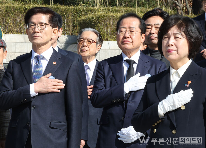 홍준표 대구시장과 김문수 고용노동부 장관이 28일 대구 달서구 2.28민주운동기념탑에 참배하기 전 국기에 경례하고 있다.[제공=연합뉴스]