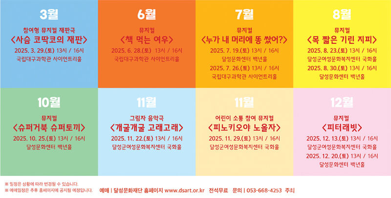 작품은 모두 전석 무료로 진행되며 만 36개월 이상 관람이 가능하다. 공연은 각각 2회씩 진행되며, 방학기간 개최되는 공연은 예외적으로 4회씩 진행된다. 공연 일정과 예매 일정 등 공연과 관련된 자세한 사항은 추후 달성문화재단 홈페이지(www.dsart.or.kr)에 공지될 예정이다. 관련 문의는 재단 문화사업팀(☎053-668-4253)을 통해 확인할 수 있다.
