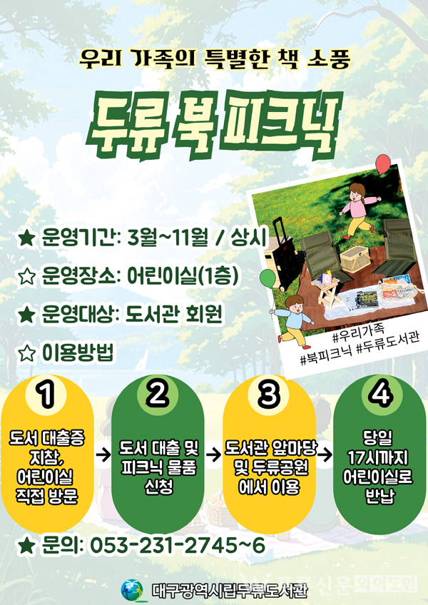 대구두류도서관 어린이실에서는 11월까지 가족들에게 책과 피크닉 물품을 함께 대여하는‘두류 북 피크닉’을 시작한다.