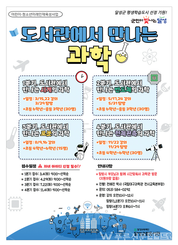 ‘도서관에서 만나는 과학’은 과학 인재 육성을 위해 국립대구과학관과 협업해 진행하는 프로그램이다. 프로그램은 과학에 대한 흥미를 유발하고자 ▷시간과 시계 ▷반도체 ▷로봇 ▷천체관측을 주제로 네 차례에 걸쳐 운영된다. 어린이와 청소년들은 이를 통해 생동감 있게 과학적 원리와 개념을 배울 수 있게 될 예정이다.
