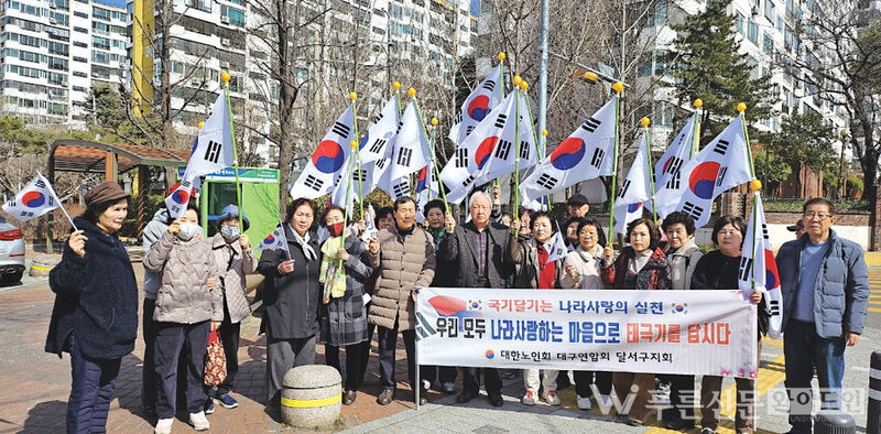 대한노인회 대구달서구지회(회장 김해동)는 제106주년 3·1절을 맞이해 태극기달기운동 시범경로당을 관내 청구그린3차경로당(회장 이매리)으로 선정하고, 아파트 관계자와 협의해 지난달 28일(금) 오후 태극기 달기운동 홍보 및 캠페인을 전개했다.