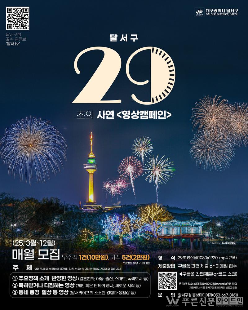 출품작은 주제 적합성, 대중성, 창의성, 작품성을 기준으로 심사해 선정되며, 우수작에는 상금 10만 원, 가작(5편)에는 2만 원 상당의 기프티콘이 제공되며, 선정된 영상은 달서구 공식 SNS를 통해 공개되며, 연말에는 참가작을 모아 ‘온라인 29초 영화제’를 개최할 예정이다.