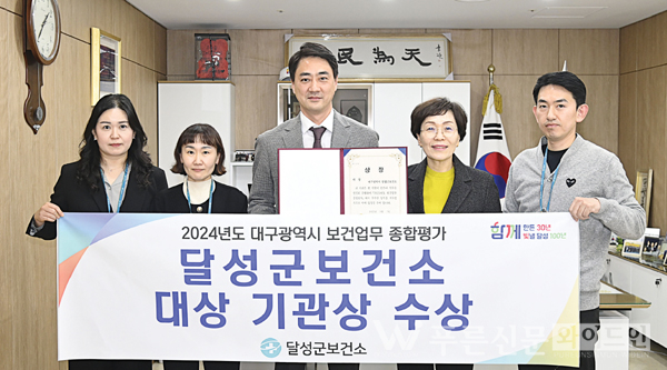 달성군보건소는 지난 10일(월) ‘2025년 대구시 보건업무 종합평가’에서 2024년 최우수상 수상에 이어 올해 ‘대상’을 수상했다. ‘대구시 보건업무 종합평가’는 대구시 구·군 보건사업의 발전을 위해 진행되는 평가로, 매 연초 구·군의 지난 한 해간 보건사업 추진실적을 평가한다. 올해 종합평가는 공통·보건·의료 및 감염병 관리, 건강증진, 외부 전문가 평가 등 12개 분야, 47개 지표 항목에 대해 실시됐다.