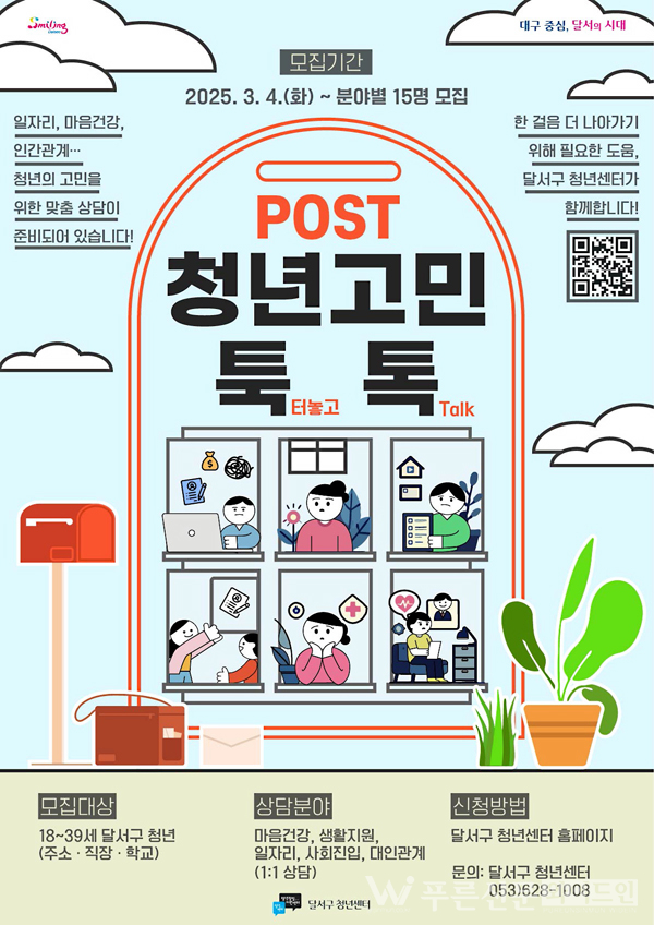 달서구는 지역 청년들의 심리적, 경제적, 사회적 고민을 해결하기 위해 맞춤형 상담 프로그램 ‘청년 고민 툭톡(툭 터놓고 Talk)’을 운영한다.