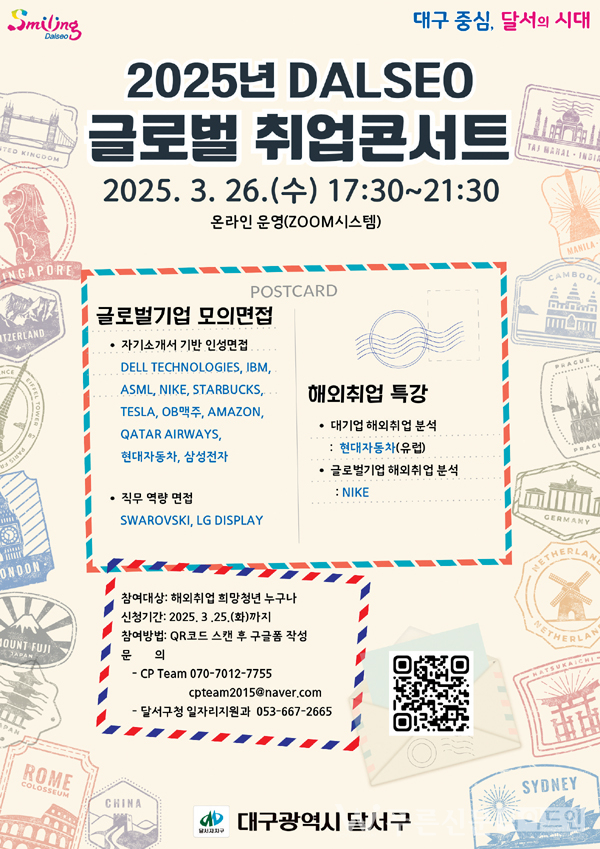 달서구는 오는 3월 26일(수) 해외취업을 희망하는 청년들을 대상으로 ‘2025년 Dalseo 글로벌 취업콘서트’를 온라인으로 개최한다.