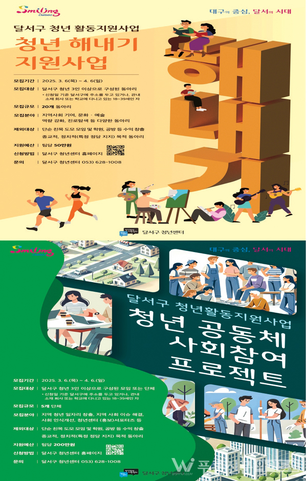달서구는 ‘청년해내기(동아리) 지원사업’과 ‘청년 공동체 사회참여 프로젝트’에 참여할 청년을 모집한다.