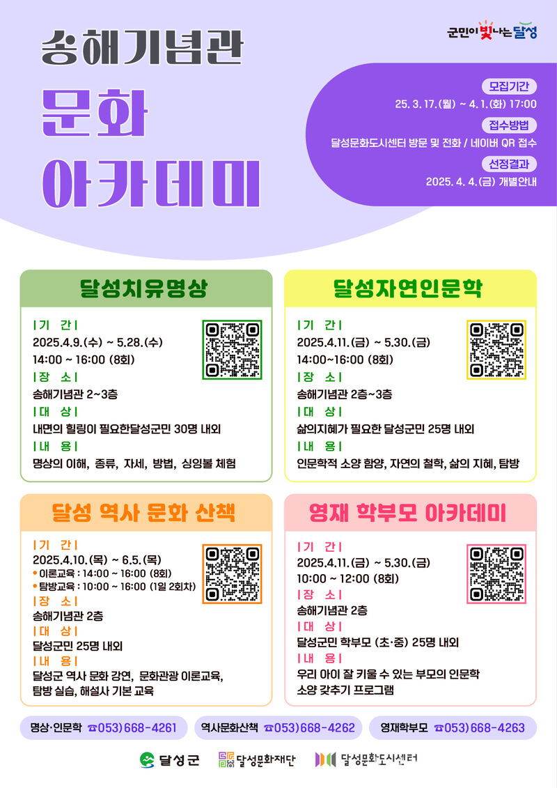오는 4월 9일부터 6월 5일까지 진행되는 이번 아카데미는 △달성치유명상 △달성 자연인 문학 △달성 역사 문화 산책 △영재 학부모 아카데미 등 네 가지 프로그램으로 구성된다.