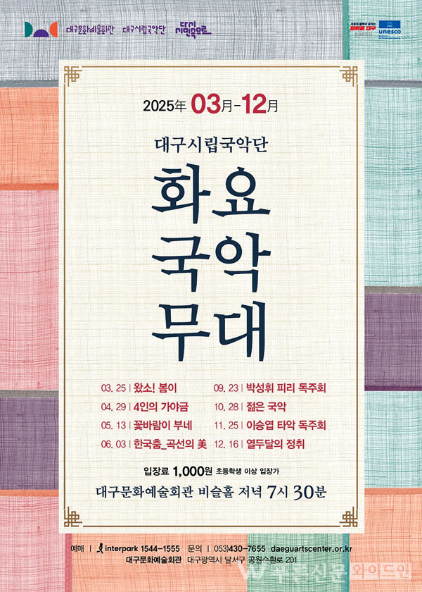 대구시립국악단은 3~12월까지 총 8회*에 걸쳐 대구문화예술회관 비슬홀에서 ‘화요국악무대’를 개최한다.