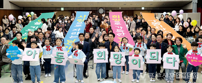 이번 기념식은 우리아이 어린이집 원아들의 율동 공연으로 시작됐으며, 이어 아동친화도시 조성에 기여한 유공자 표창, 아동보호 행동강령 서약식 그리고 아동합창과 함께 ‘아동이 희망이 되는 달서구’ 선포 퍼포먼스를 진행했다.