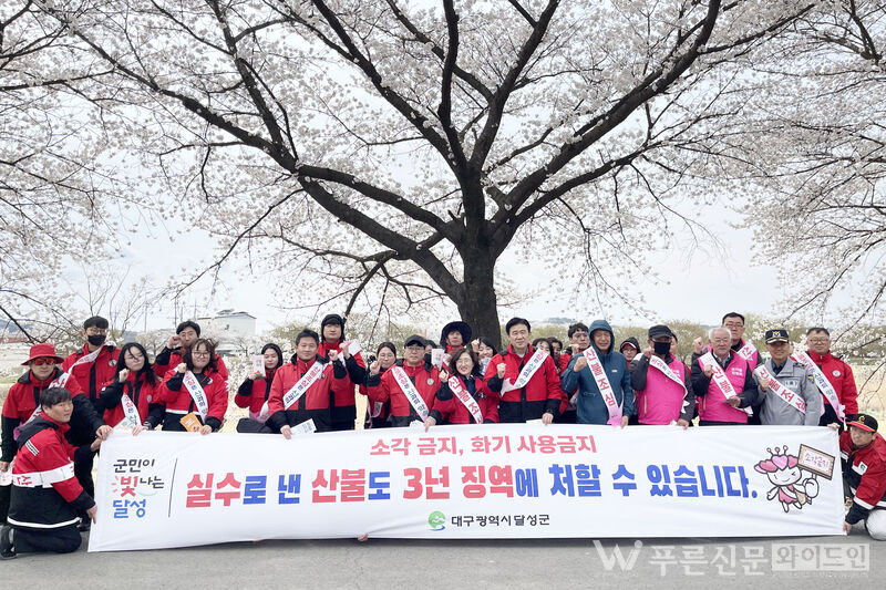 신속 진화부터 예방 홍보 캠페인 [자료제공= 달성군청]이번 캠페인은 전국적으로 산불이 빈번히 발생하는 가운데, 지난 26일 옥포읍 기세리에서 발생한 산불로 경각심이 고조됨에 따라 마련되었으며 당시 산불은 오후 7시 29분경에 발생했으나, 열악한 지형과 기상조건에도 불구하고 달성군, 대구시, 소방, 경찰 등 유기적인 진화체계와 지역주민의 협조 덕분에 조기에 진화되어 큰 피해를 방지할 수 있었다.